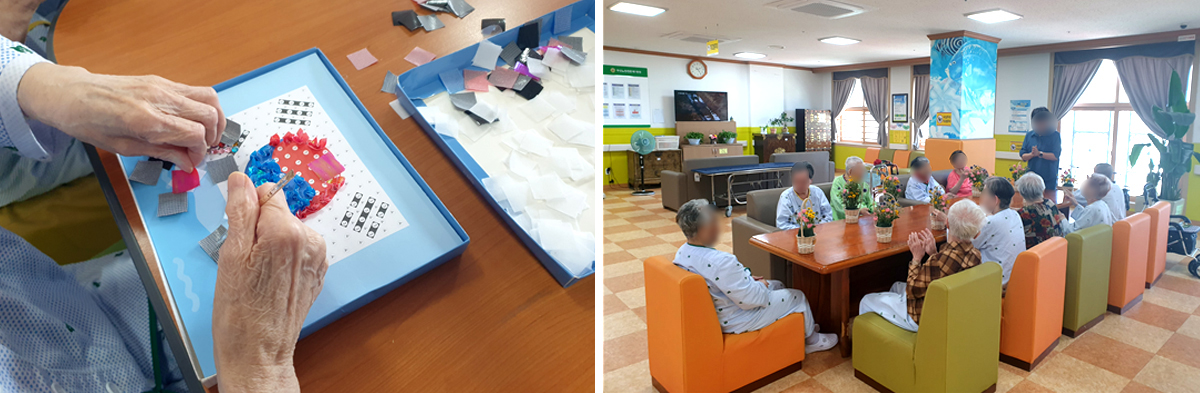 • 입원 치매환자의 기능 유지 및 인지기능 향상을 위해 개인 및 집단으로 비약물 치료 프로그램을 제공 (원예치료, 미술치료, 건강체조, 음악치료, 인지프로그램)